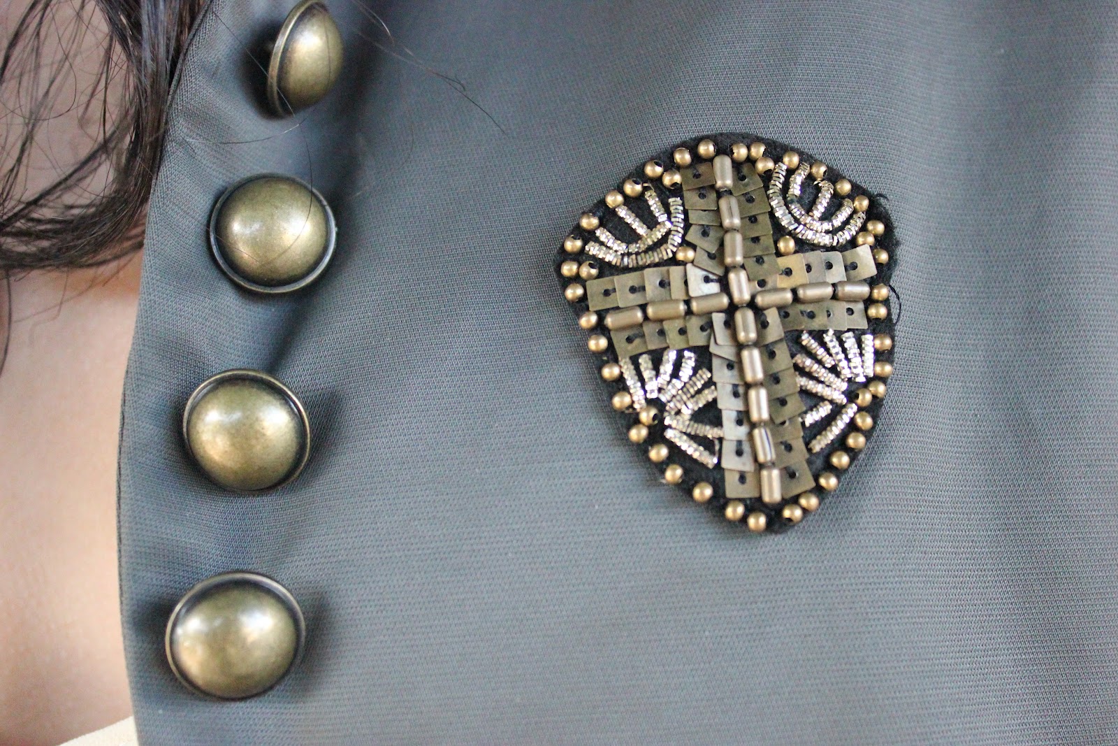 | Cropped Grey Military Jacket and Bronze Wing Cuff Bracelet Forever 21 | Cream Dress Aryn. K | Gold Metallic Peep Toe Flats Christian Louboutin |