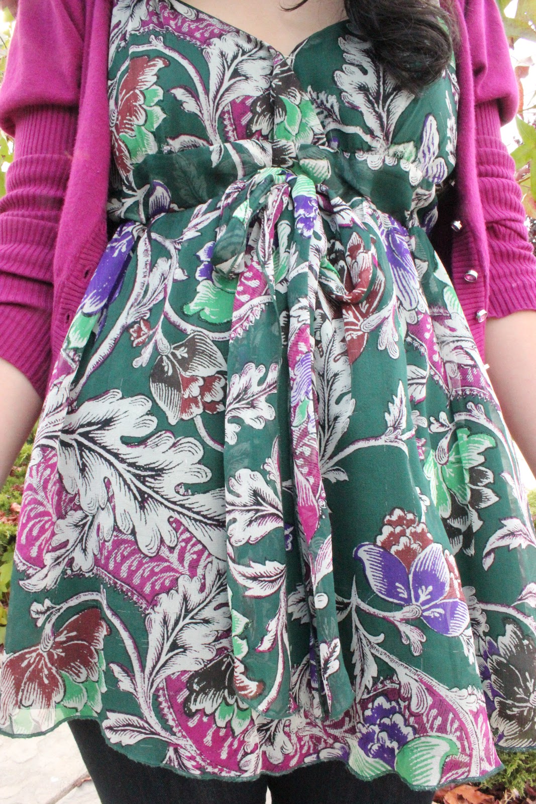 | Raspberry Pink Cardigan Forever 21 (here) | Forest Green Floral Tank Diane von Furstenberg (here) | Dark Wash Jeans Forever 21 | Tianna Suede Boots Steve Madden |