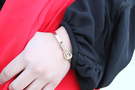 | White Princess Coat Steve Madden (available in black here) | Black Silk Blouse Diane von Furstenberg | Red Midi Skirt Express | Cheers Necklace and Gift Bow Earrings Kate Spade | Buckle Down Bracelet in Gold Urban Gem via Rocksbox | Gold Leather Triple Wrap Tassel Bracelet E. Kammayer Accessories (here) | Black Patent Ulltra Pumps Steve Madden | Lipstick: Le Rouge GRENAT INITIE 307 Givenchy (here) | |